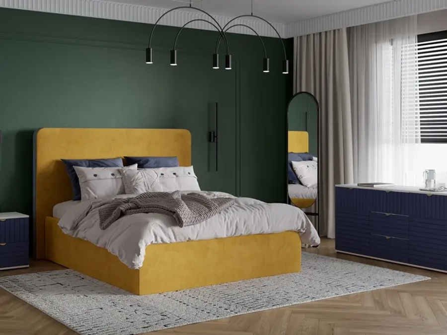 Да, если выбрать нейтральную обивку и лаконичную форму. Контрастный кант работает тонко — он подчёркивает линии без утяжеления, поэтому кровать остаётся визуально лёгкой даже при большой высоте.