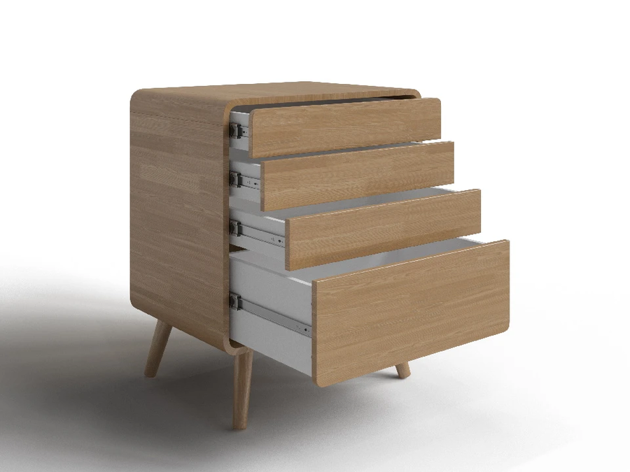 Айлин - комод для тех, кто ценит чистые линии и продуманные детали. Скруглённые углы корпуса, соединённые на шип, разноуровневые фасады и полное отсутствие ручек создают образ, который одинаково уместен в строгой скандинавской спальне и в мягком уютном интерьере. Открыть ящик - одно лёгкое нажатие.