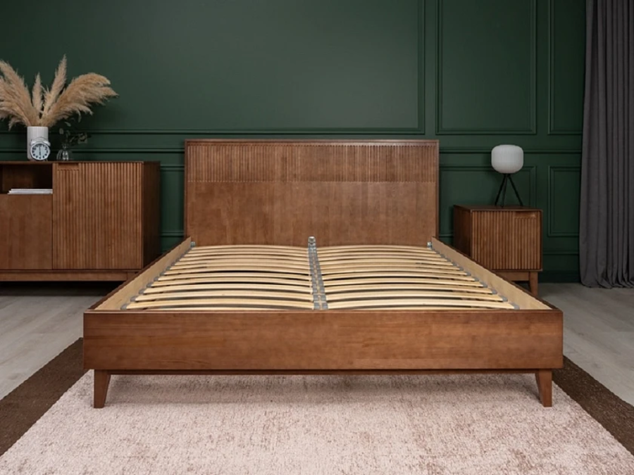 Интегрированное березовое основание с ламелями крепится к боковинам кровати, по центру основание усилено двумя опорами.